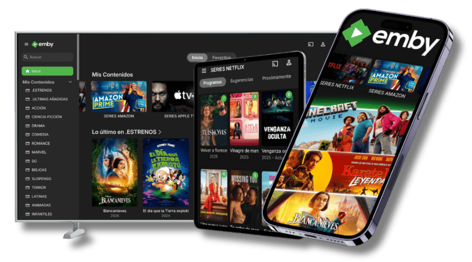 EMBY es el servicio de streaming de películas y series que lo tiene todo. Con el mejor contenido de todas las plataformas como, Netflix, Prime Video, Disney+, MAX, Paramount, Apple tv, estrenos de Cine y más